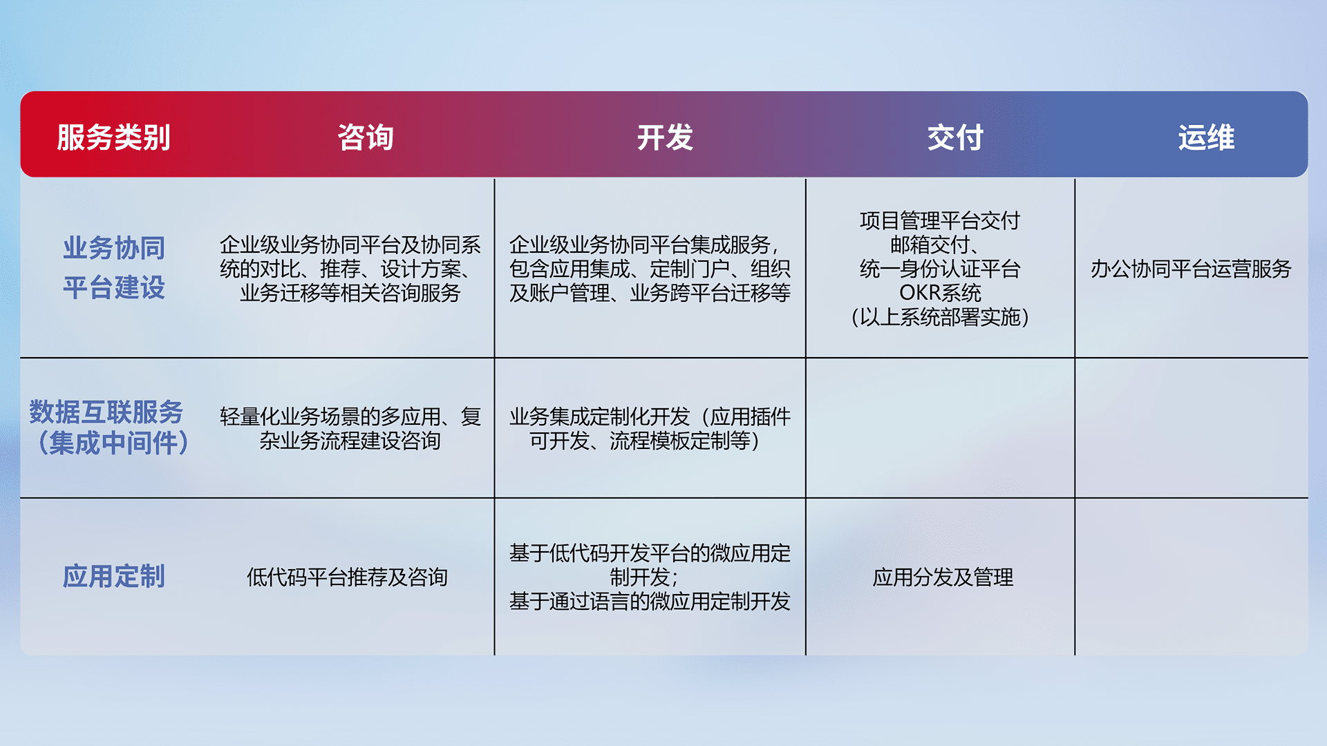 针对钉钉、、、、企微、、、、IDaas等平台级产品提供产品的规划、、、、方案、、交付、、、、定制化开发等服务,,,实现如统一协同办公、、、智能客户服务、、混合会议管理、、智能数据查询、、、、等业务场景,,,实现数字化转型。。